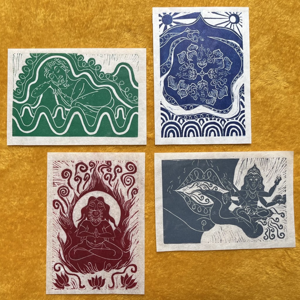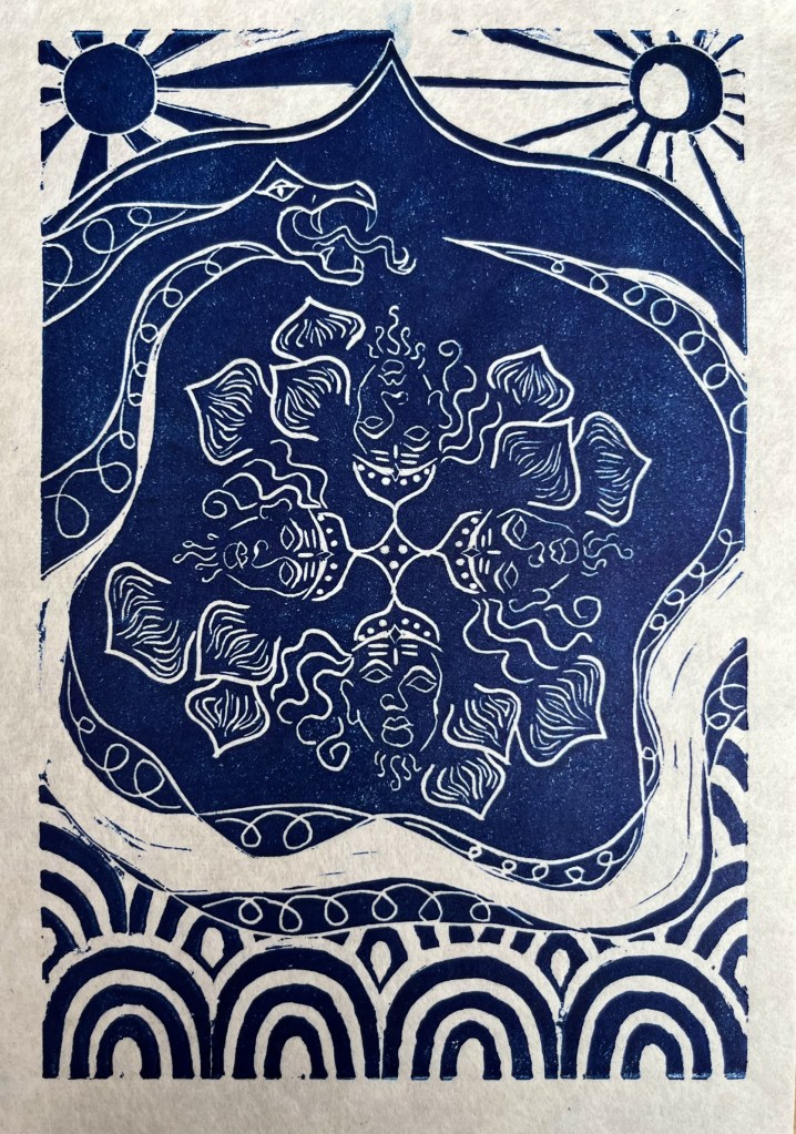 In the beginning, there was nothing. From that emptiness, divinity emerged. First came water, which slowly started moving and bubbling before vast oceans persisted. Eventually from that water came a great serpent. The serpent was carrying Lord Vishnu, sleeping on its back. Out from Lord Vishnu’s belly button a lotus flower unfurled. And from that lotus flower came Lord Brahma, the ultimate Supreme Being — all-gendered, divinity manifest, with four heads to see in all four directions. From Lord Brahma all things are created: the sun, the moon, the human, the animal… Then comes Shiva, the destroyer, and so all is burned down.